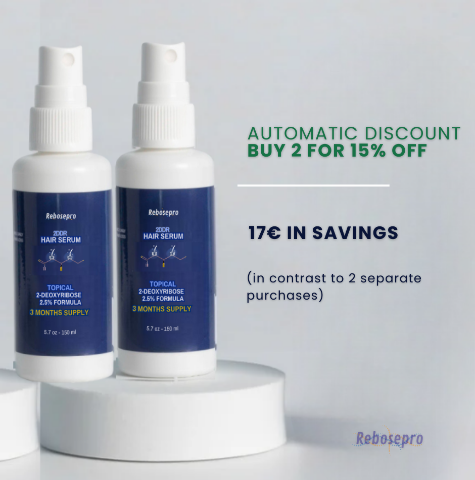 Deoxyribose or more precisely 2-deoxyribose, is a naturally occurring sugar in human DNA which has been proven to grow hair in treating testosterone-driven hair loss in mice by University of Sheffield and COMSATS University of Pakistan. This is obviously hugely promising for male pattern hair loss. However we don't make any claims about its effectiveness as we need large clinical trials to show its direct effect on human hair follicles as safety as hair loss treatment.