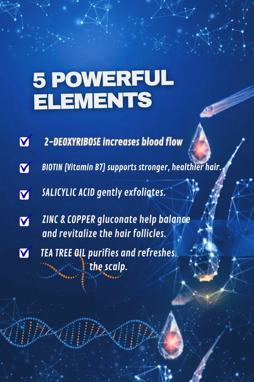 At the heart of the formula lies 2.5% Deoxyribose (2-deoxy-D-ribose) — a naturally occurring sugar found in human DNA and explored in laboratory research, including studies on increased scalp blood flow conducted at the University of Sheffield and COMSATS University Islamabad.